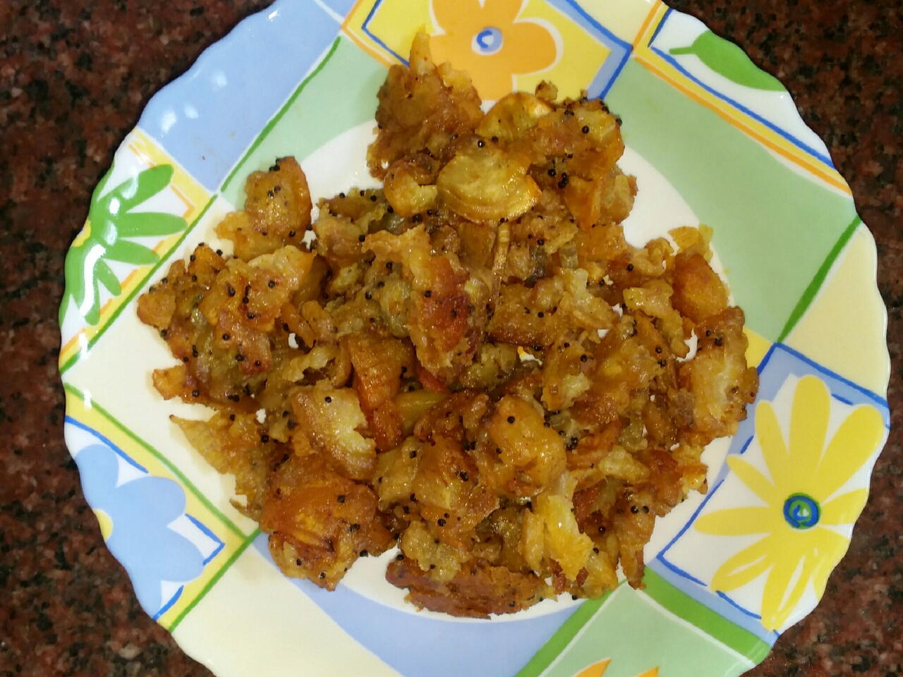Heat oil. Add mustard and chopped plantain. Add a pinch of turmeric powder and toss well.