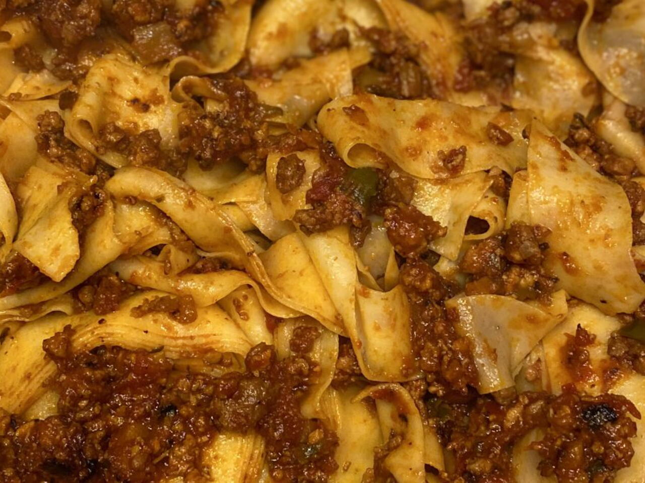 During the last 15 minutes or so for the Bolognese, cook pappardelle pasta according to package directions.