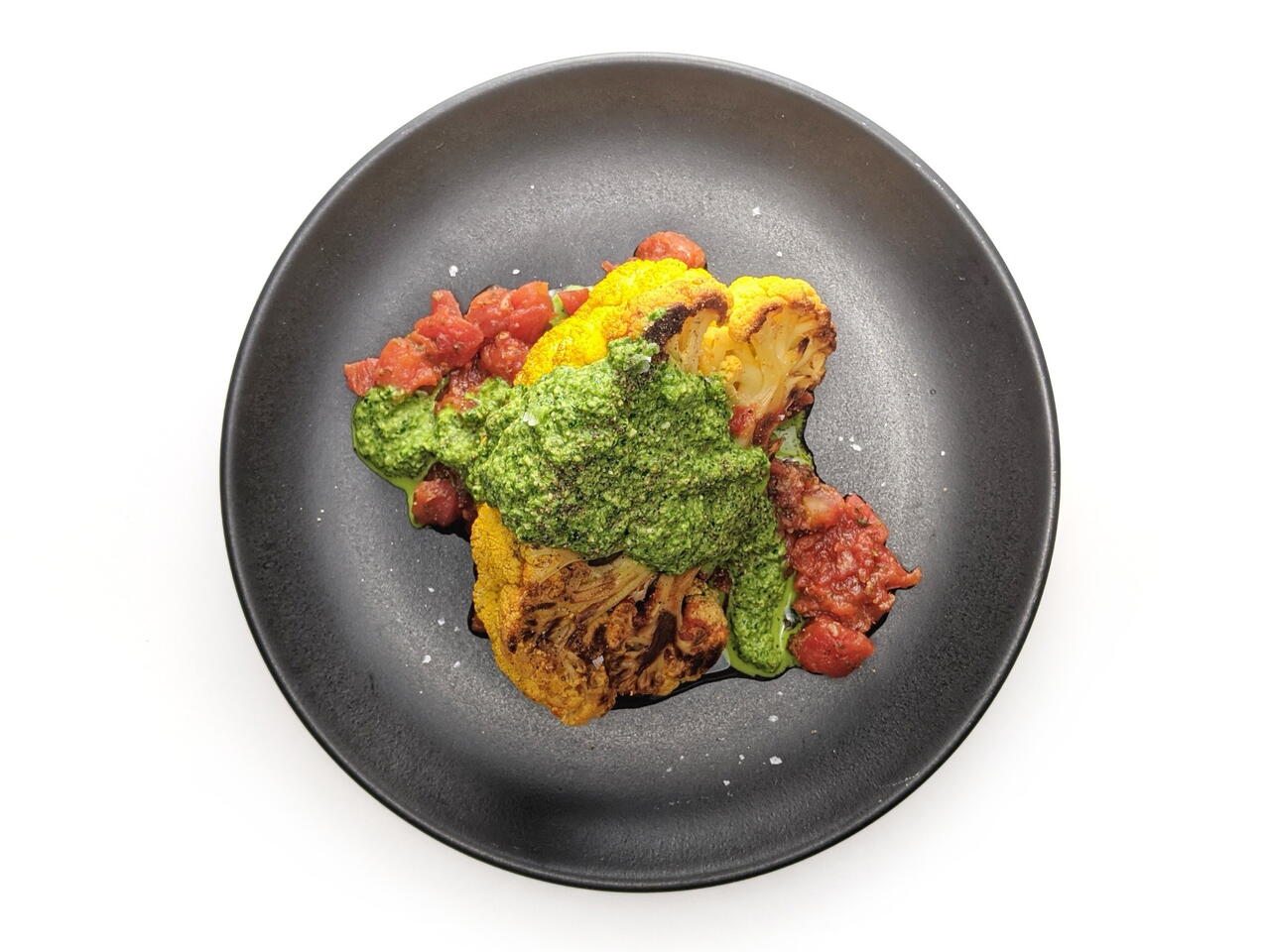Serve a wedge of roasted cauliflower over a scoop of tomatoes. Top with a big scoop of the spinach sauce.