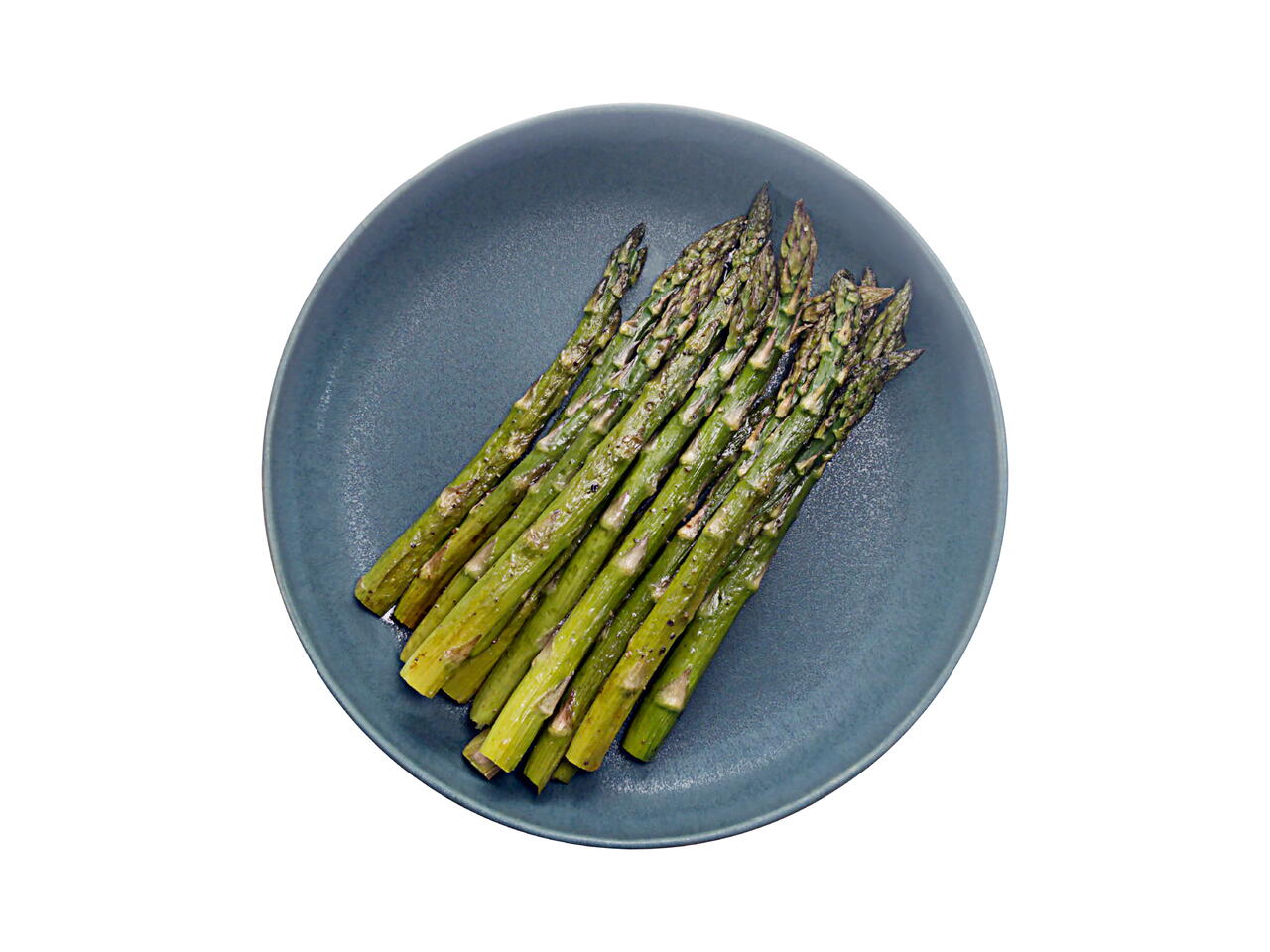 Roast the asparagus at 375ยฐF for 12-15 or until just tender. If your stalks are much thinner, reduce the time.