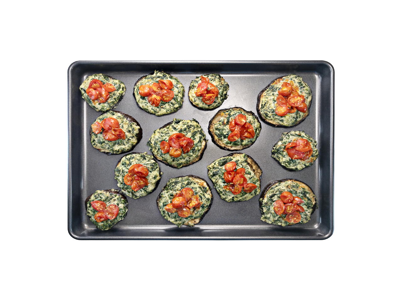 Add the tomatoes to the spaces between the eggplant rounds.