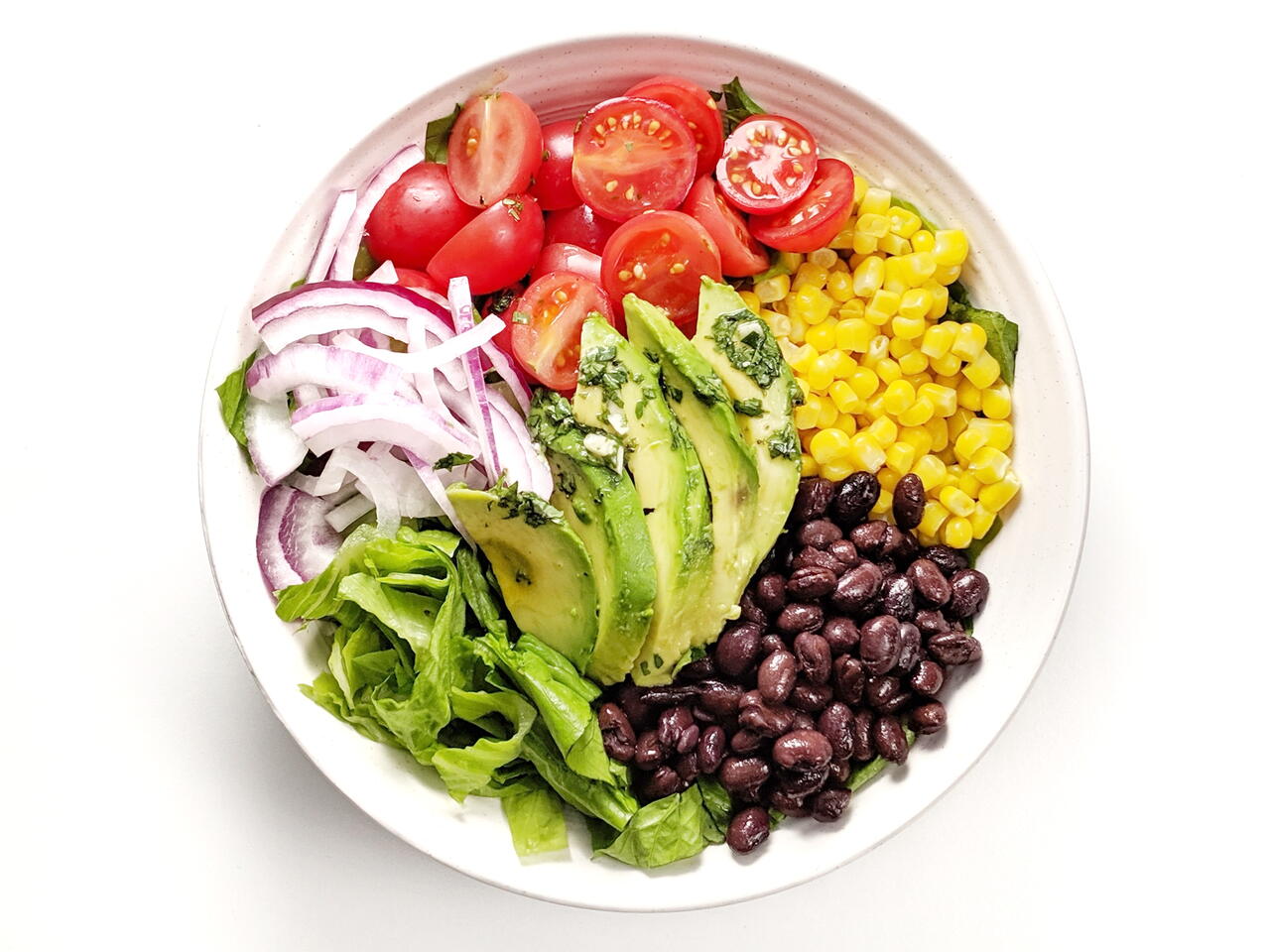 Top the chopped romaine with black beans, corn, and tomatoes.