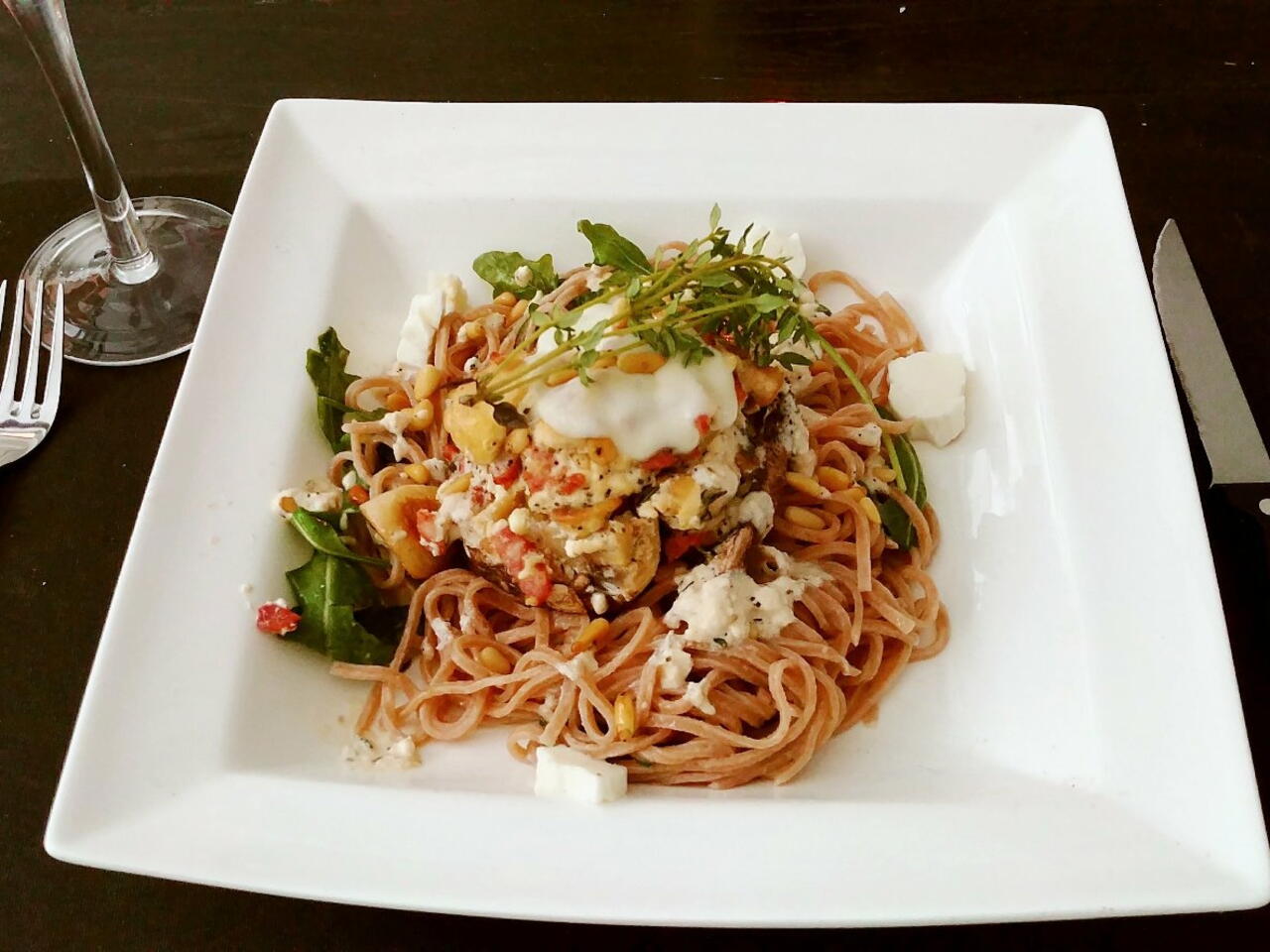 Put the spaghetti on a plate place the portobello on top and garnis wit some basil and time