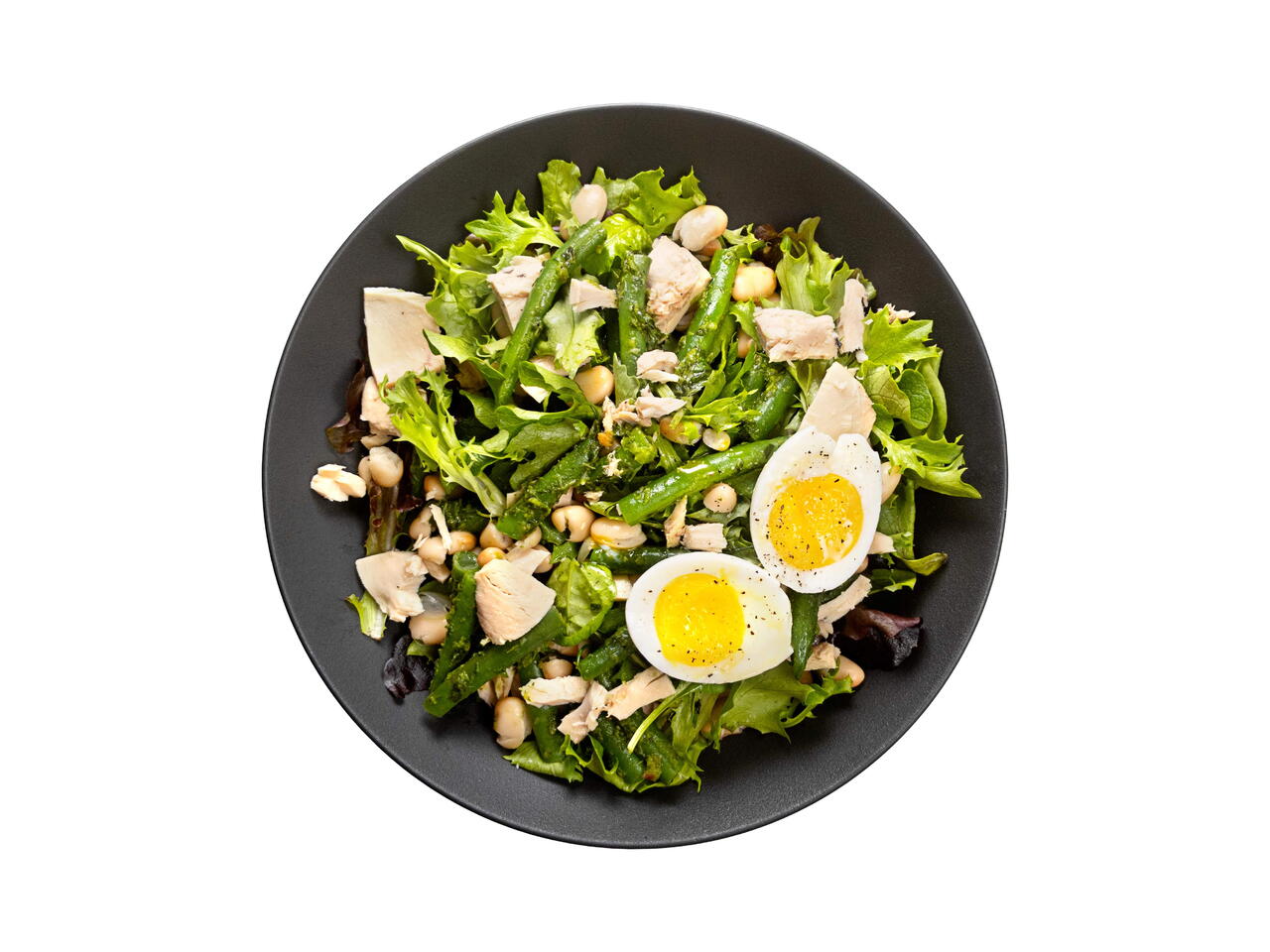 Assemble the salad by topping the mixed greens with the tuna, white beans, and green beans with basil vinnaigrette. Then carefully cut open one soft boiled egg per salad to plate.