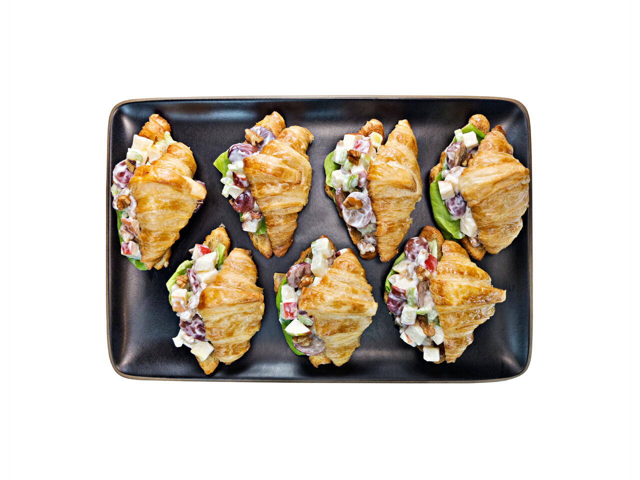 Optionally, add a leaf of butter lettuce to the base of each croissant. Then top with a heaping spoonful of waldorf salad. Add the croissant top.