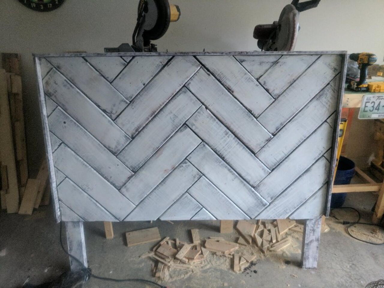 Base frame constructed with 2x4 and plywood. Made correct measurements for design and used wood glue and nails to place pallet wood on the plywood. Use pallet wood as the border. I stained it with mohagoney stain and the later paint and polyurethane.