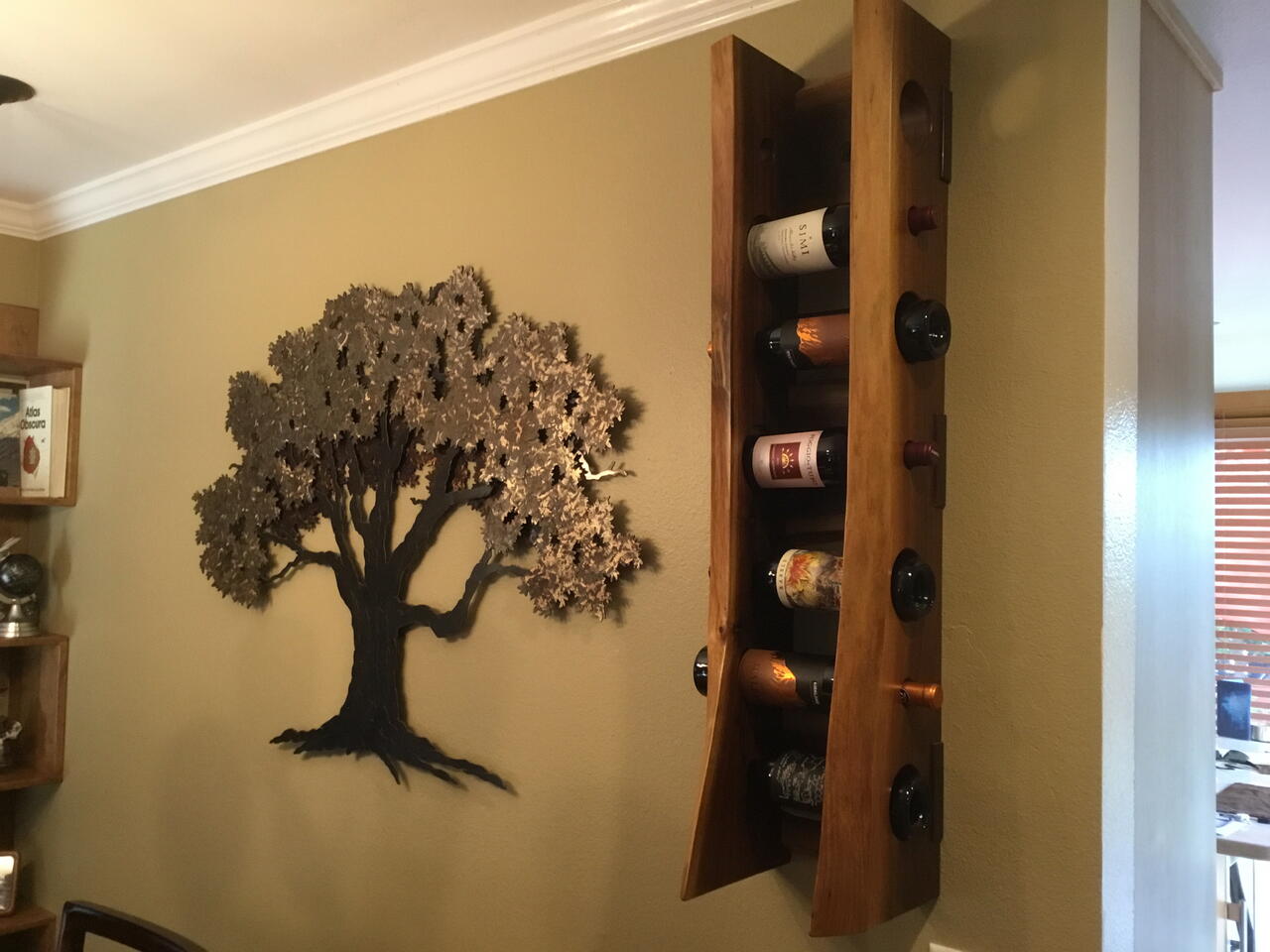 Size the overall length, cut your slab down the middle, layout holes and rabbit connecting pieces, sand before assembly, assemble five pieces together, apply finish satin clear poly. Fill up your rack and enjoy the compliments from friends! Cheers