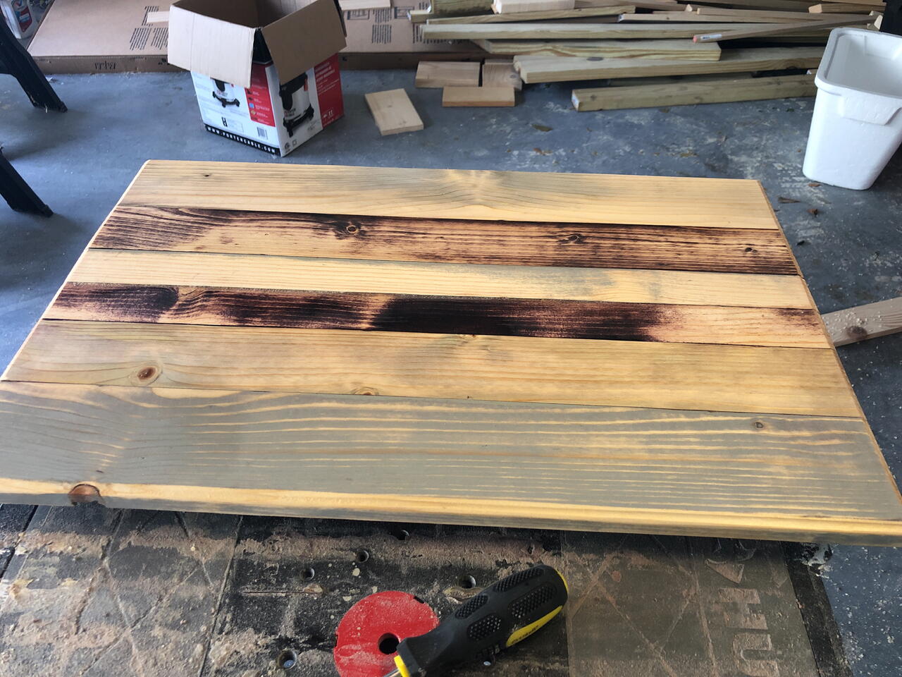 Mitre cuts to 2 feet in length, sanded and stained, then glued. Sanded down for rustic finish and then clear coated.