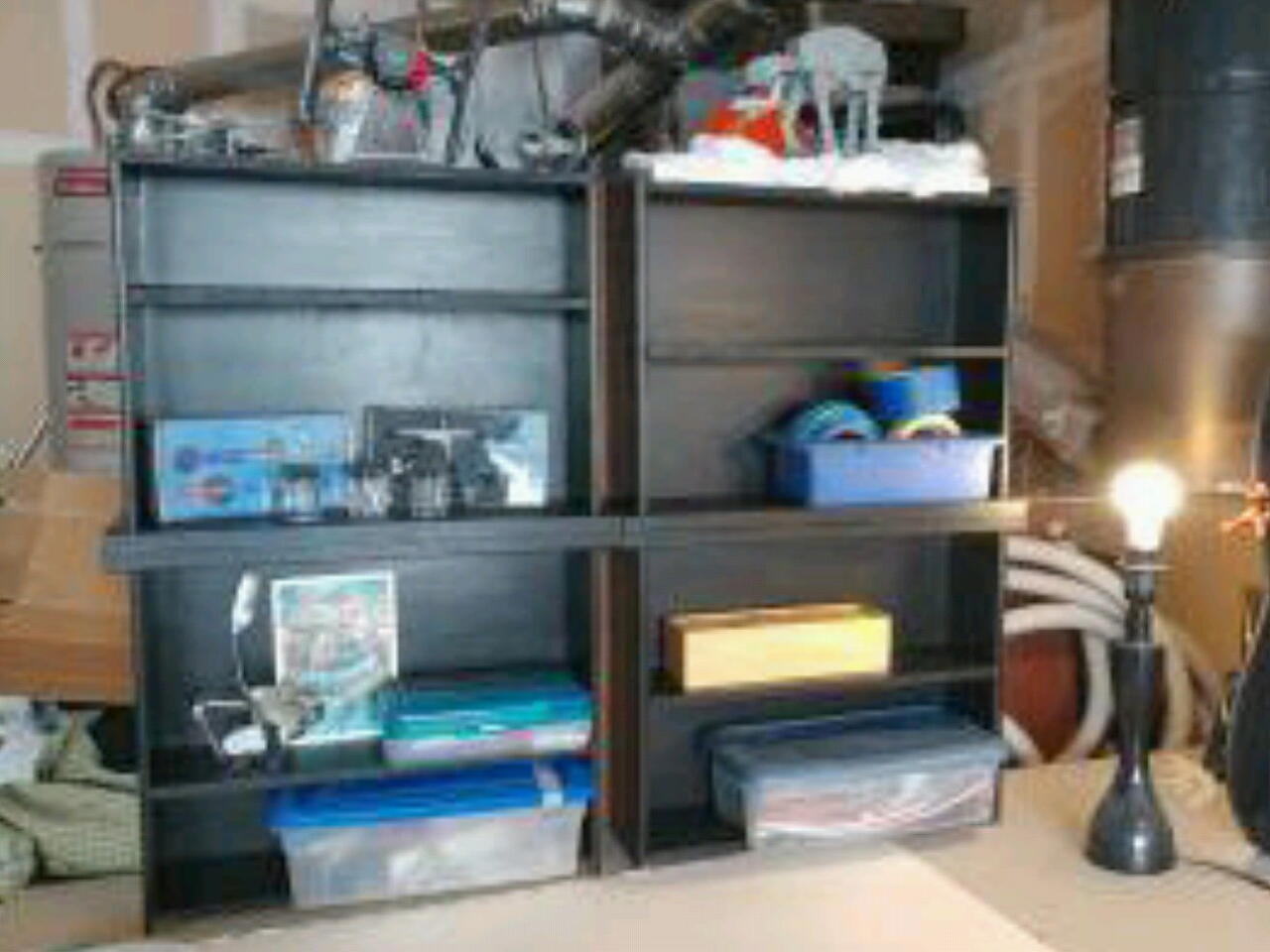 Mom had an old dresser that was falling apart so I was instructed to go hulk smash on it. From the lumber off of the dresser, I made these shelves and a rolling workbench.