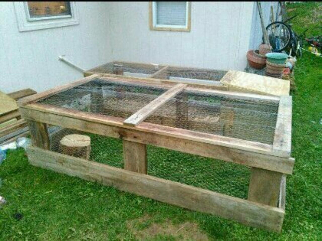 Sheet of plywood, scrap lumber, hinges, a latch, and chicken wire.