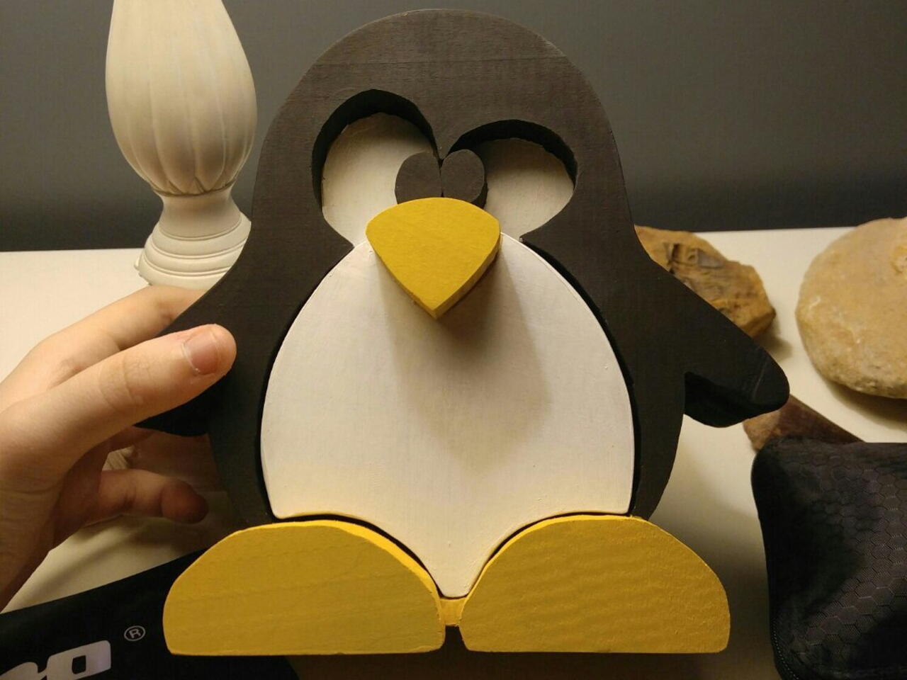 My woodwhop teacher said we had to make a bandsaw box but we could be creative with what we made so I made mine tux the Linux OS logo. Unfortunately since with is the first project I ever painted I didn't realize how thick the paint would be to the drawer doesn't open anymore.
