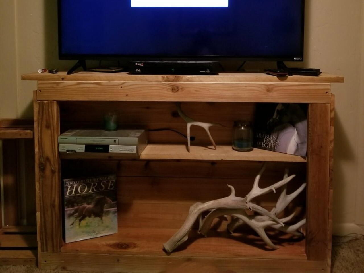 Been meaning to build this for awhile.. before we had our tv on a huge piece of furniture that took up a ton of space.. now it looks better and we gained a ton of room! Built from scrap wood laying around in the shop.. 2×4s and some cedar planks